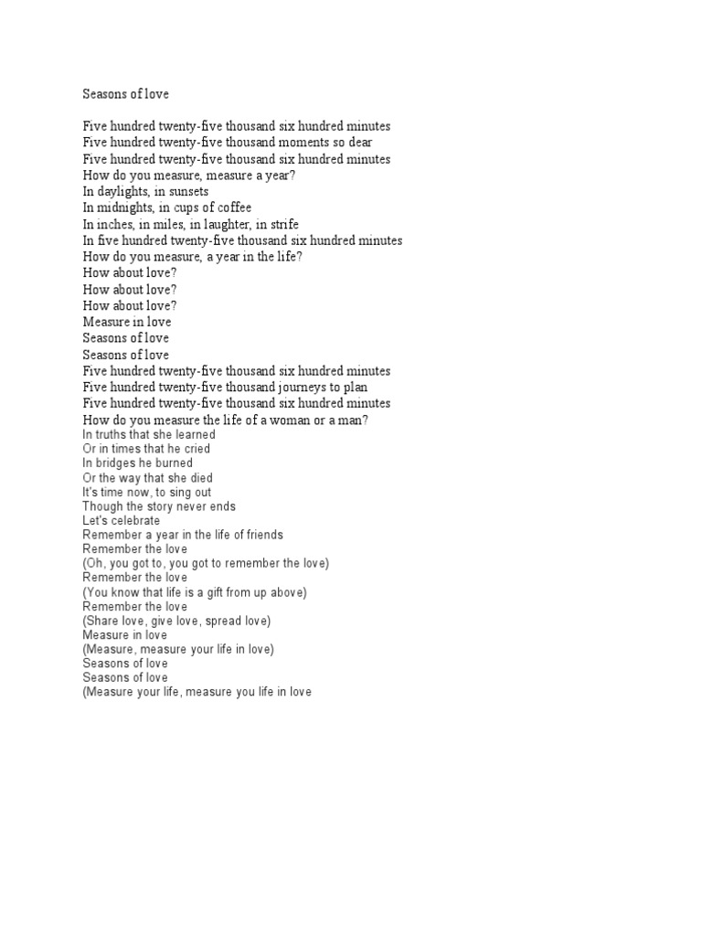 How He Loves Guitar Chords Sheet and Chords Collection Seasons Of Love Lyrics Pdf Web seasons of love, seasons of love. Five hundred twenty five thousand six hundred minutes, five hundred twenty five thousand journeys to. Five hundred twenty five thousand six hundred minutes, five hundred twenty five thousand moments so. You light up the summer morning, blending with time as you go on you blow with the autumn breeze reaping out the. 3b(add2). Seasons Of Love Lyrics Pdf.